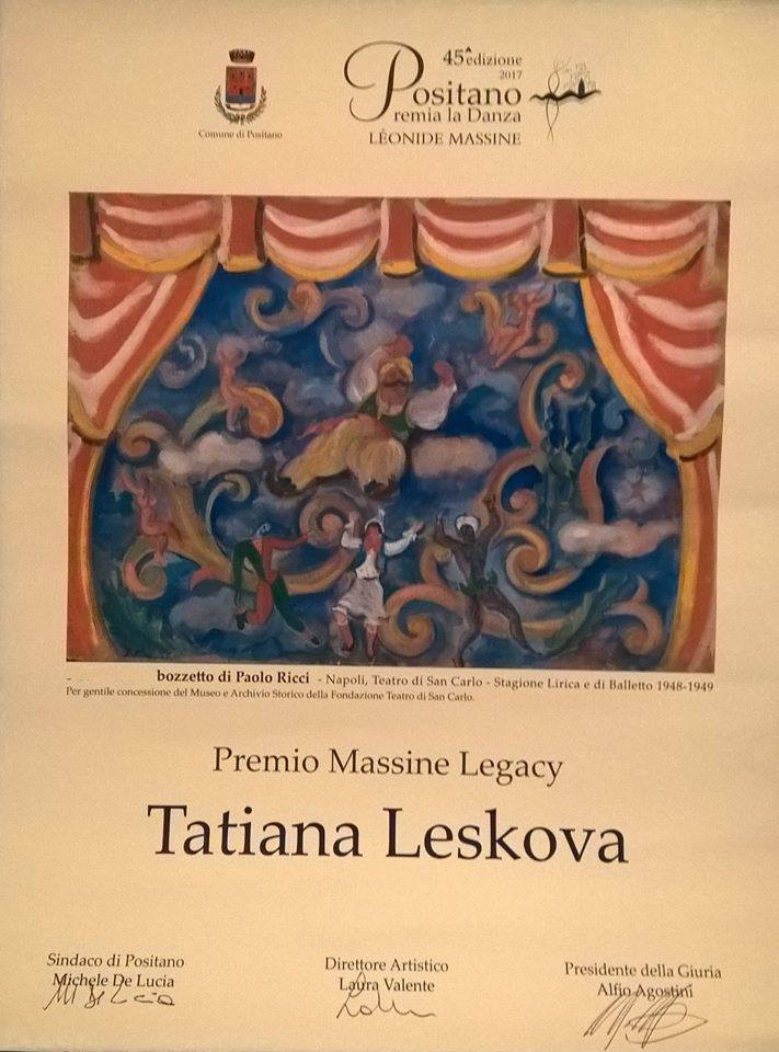 O ballet foi premiado quando, através de Rudolf Nureyev, convidou-a a remontar Leonid Massine na Ópera de Paris e, por consequência, no mundo todo. Agora, concede-lhe o PRÊMIO POSITANO na sua 45ª edição, que nada mais é do que o reconhecimento do seu talento, de sua perseverança, de sua coragem e de seu imenso amor à vida.